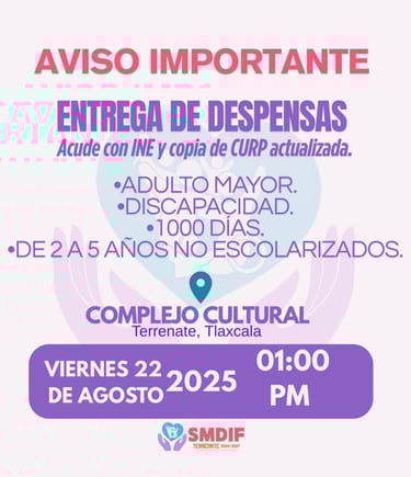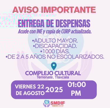 Se informa a la ciudadanía que el viernes 22 de agosto de 2025, en punto de la 01:00 de la tarde se realizará la entrega de despensas en las instalaciones del Complejo Cultural.