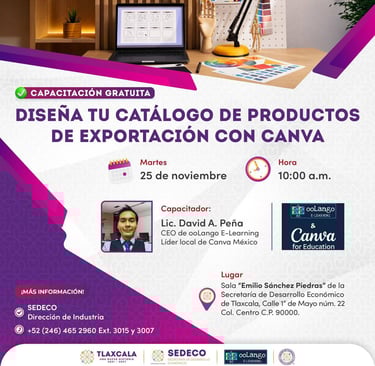 La sesión será impartida por el Lic. David A. Peña, CEO de ooLango E-Learning y líder local de Canva México, quien compartirá estrategias y técnicas para crear catálogos digitales atractivos, profesionales y enfocados en la exportación de productos.