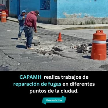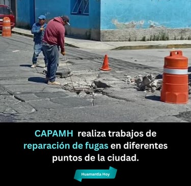 Con el compromiso de brindar un servicio eficiente y dar respuesta oportuna a las solicitudes de la ciudadanía, personal de la Comisión de Agua Potable y Alcantarillado del Municipio de Huamantla (CAPAMH) llevó a cabo trabajos de reparación de fugas en diferentes puntos de la ciudad.