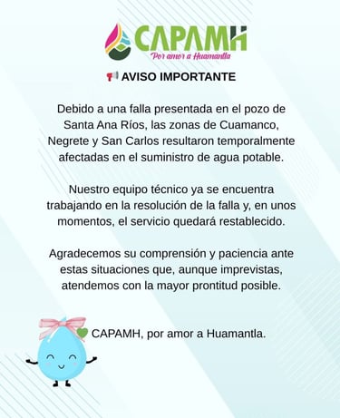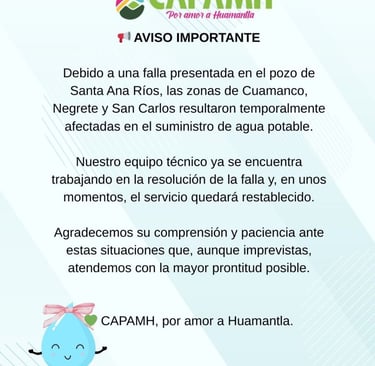 (CAPAMH) informa a la ciudadanía que, debido a una falla presentada en el pozo de Santa Ana Ríos, diversas zonas del municipio registraron afectaciones temporales en el suministro de agua potable,