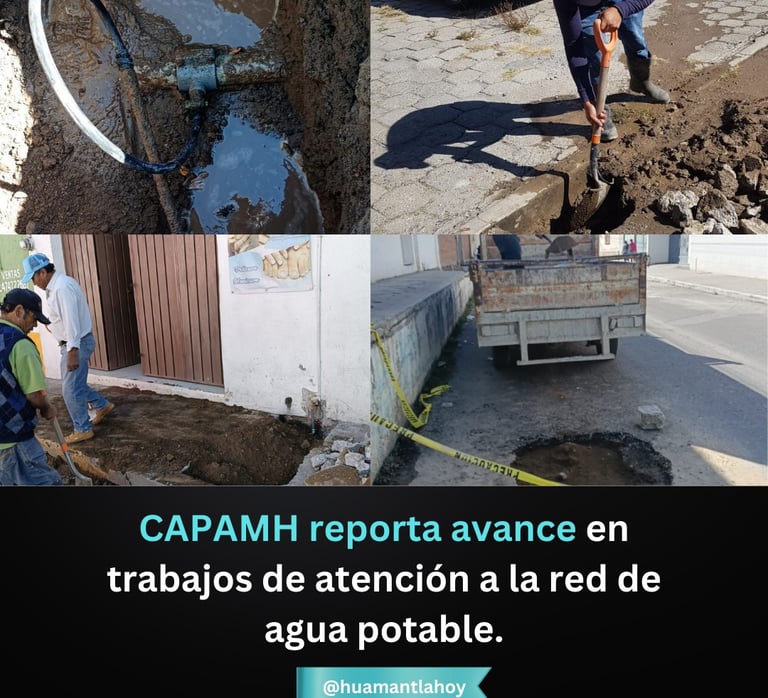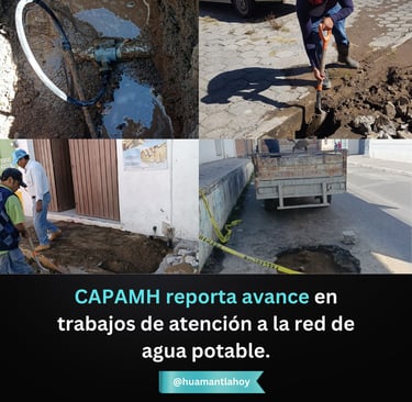 Huamantla, Tlaxcala. 6 Enero 2026— Como parte de las acciones permanentes para fortalecer el servicio de agua potable en el municipio, la Comisión de Agua Potable y Alcantarillado del Municipio de Huamantla (CAPAMH) informa sobre el avance en la atención de diversas fugas detectadas en distintos puntos de la ciudad.