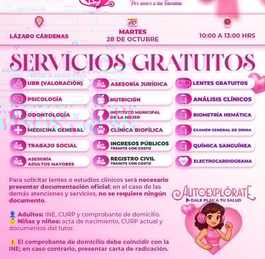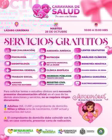 Huamantla, Tlax., 27 de Octubre 2025. - El Gobierno Municipal de Huamantla, a través del Sistema Municipal para el Desarrollo Integral de la Familia (SMDIF), invita a la ciudadanía a participar en la Caravana de la Salud, que se llevará a cabo este martes 28 de octubre, de 10:00 a 13:00 horas, en la comunidad de Lázaro Cárdenas.