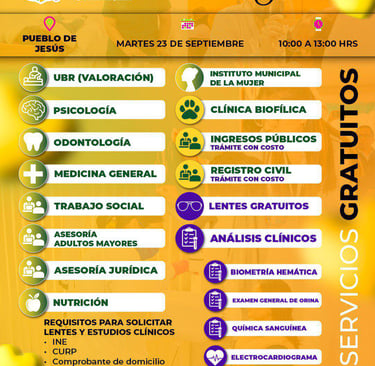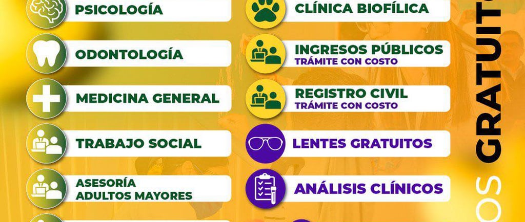 Los servicios gratuitos que se ofrecerán durante esta campaña incluirán medicina general, psicología, odontología, nutrición, trabajo social, asesoría jurídica, asesoría a adultos mayores, valoración en ubr, Instituto municipal de la mujer, clínica biofílica, lentes gratuitos así como análisis clínicos.