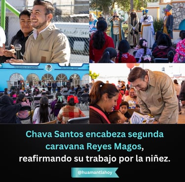 Huamantla, Tlax.- Miércoles 7 Enero 2026.- En el segundo día de actividades de la Caravana de Reyes Magos en tu Comunidad, el presidente municipal de Huamantla, Salvador Santos Cedillo, encabezó el recorrido por diversas comunidades, llevando regalos, alegría y un mensaje de cuidado y protección a las niñas y niños huamantlecos.