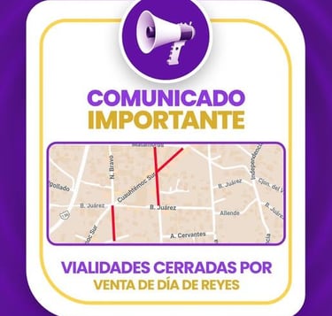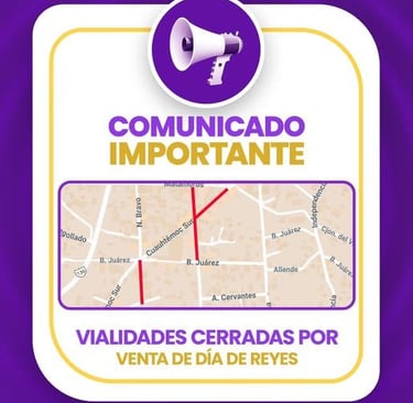 El Gobierno Municipal de El Carmen Tequexquitla informa que durante todo el día se mantendrán cerradas temporalmente las siguientes vialidades debido a la venta con motivo del Día de Reyes: