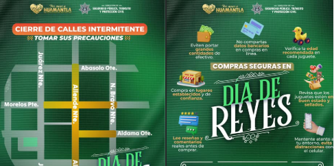 Huamantla, Tlax.-Lunes 5 Enero 2026. - El Gobierno Municipal de Huamantla informa a la ciudadanía que, con motivo de la instalación del tradicional Mercado de Día de Reyes, se llevará a cabo el cierre temporal de algunas vialidades del centro del municipio.