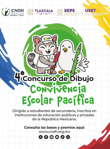 Miércoles 20 de agosto 2025.- La Comisión Nacional de los Derechos Humanos (CNDH) y el Gobierno del Estado de Tlaxcala, a través de la Secretaría de Educación Pública del estado y la Unidad de Servicios Educativos de Tlaxcala (SEPE-USET), emitieron la convocatoria del 4º Concurso de Dibujo “Convivencia Escolar Pacífica”, dirigido a estudiantes de nivel secundaria de la República Mexicana, con el propósito de favorecer su participación en la reflexión sobre la cultura de paz y el respeto de los derechos humanos en las instituciones educativas.