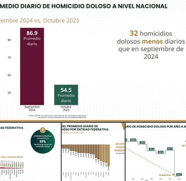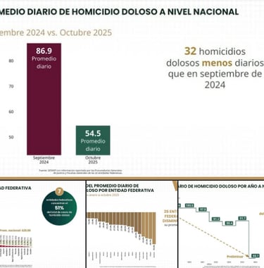 El reporte del SESNSP resalta la disminución de 37 por ciento en el promedio diario de homicidios dolosos, de septiembre de 2024 a octubre de 2025, al pasar de un promedio de 86.9 víctimas diarias a 54.5, respectivamente, lo que indica que hubo 32 homicidios dolosos menos diarios. Además, el promedio diario de homicidios dolosos por año, a nivel nacional, también presentó una reducción del 34 por ciento entre 2018 y los 10 meses de 2025, al pasar de 100.5 a 66.1.