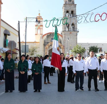 El desfile fue encabezado por la presidenta municipal Aline Lazo Caballero, acompañada de las y los integrantes del cabildo, así como de directores, coordinadores y personal administrativo del ayuntamiento, quienes marcharon al frente mostrando unidad institucional.