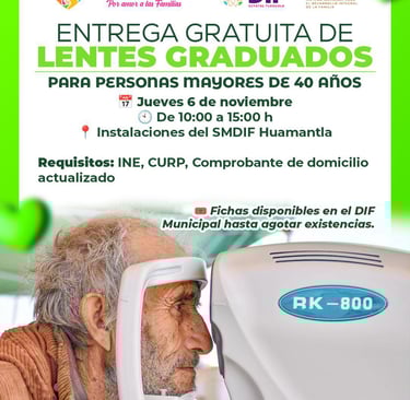 Huamantla, Tlax.- Sábado 01 Noviembre 2025.- Con el objetivo de fortalecer la salud visual y mejorar la calidad de vida de la población, el Sistema Municipal DIF Huamantla, en colaboración con DIF Nacional y DIF Estatal, llevará a cabo una jornada de entrega gratuita de lentes graduados dirigida a personas mayores de 40 años.