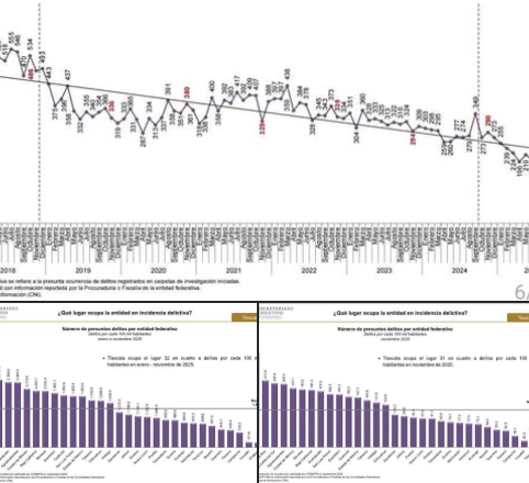 Mientras, al comparar de enero a noviembre de 2025, Tlaxcala se ubica en el sitio 32, con el menor número de delitos de todo el país, con 161.5.