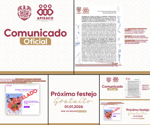 Ante esta situación, el Presidente Municipal, Javier Rivera Bonilla, ha determinado que el Ayuntamiento de Apizaco asumirá la organización del tradicional festejo del Primero de Enero, el cual se realizará mediante un Festival Taurino, cuyos detalles serán confirmados y dados a conocer oportunamente.