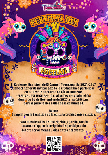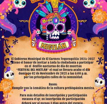 El H. Ayuntamiento de El Carmen #Tequexquitla invita a toda la ciudadanía a participar en el Desfile Nocturno de Día de Muertos “Festival del Mictlán.