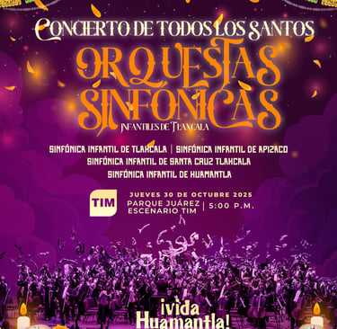 Huamantla, Tlax., 30 Octubre 2025.- En el marco del Festival de Día de Muertos Vida Huamantla, el Gobierno Municipal que preside Salvador Santos Cedillo invita a la ciudadanía a disfrutar este jueves 30 de octubre del Concierto de Todos los Santos, un encuentro cultural que reunirá a las Orquestas Sinfónicas Infantiles de Tlaxcala, Apizaco, Santa Cruz Tlaxcala y Huamantla.
