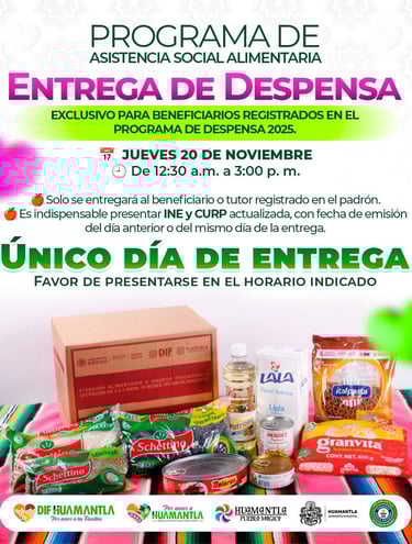Huamantla, Tlax., Martes 18 Noviembre 2025. - En un esfuerzo coordinado para mejorar las condiciones de vida de las familias huamantlecas, el DIF Huamantla y el Sistema Estatal DIF (SEDIF) realizarán una nueva entrega de despensas este jueves 20 de noviembre en un horario de 12:30 a 15:00 horas, únicamente para las personas registradas en el padrón 2025.