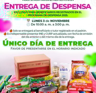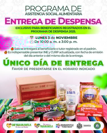 Huamantla, Tlax., 30 Octubre 2025. -El Sistema Municipal para el Desarrollo Integral de la Familia (SMDIF) Huamantla informa que el próximo lunes 3 de noviembre se realizará la entrega de despensas correspondientes al mes de noviembre, en un horario de 10:00 a.m. a 3:00 p.m., exclusivamente para los beneficiarios registrados en el padrón 2025 del Programa de Asistencia Social Alimentaria.