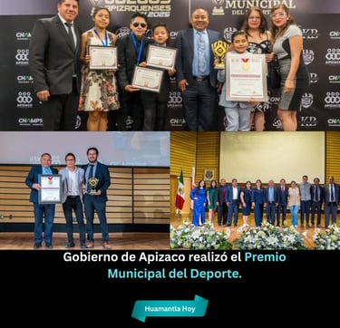 Apizaco, Tlax.- Lunes 24 Noviembre 2025.- En un ambiente de orgullo, unidad y celebración, el Gobierno Municipal de Apizaco llevó a cabo este jueves la Premiación de los Juegos Apizaquenses 2025 y la entrega del Premio Municipal del Deporte, reconociendo el trabajo, disciplina y pasión de deportistas del municipio.