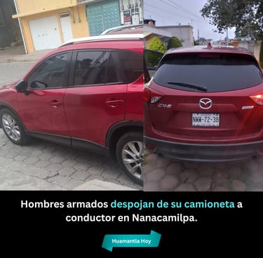 Nanacamilpa, Tlaxcala.- Lunes 10 Noviembre 2025.- Un violento asalto se registró la tarde de este lunes 10 de noviembre, luego de que dos sujetos armados despojaran a un hombre de su camioneta Mazda CX-5 color vino mientras se encontraba en una gasolinera ubicada sobre la calle Juárez.