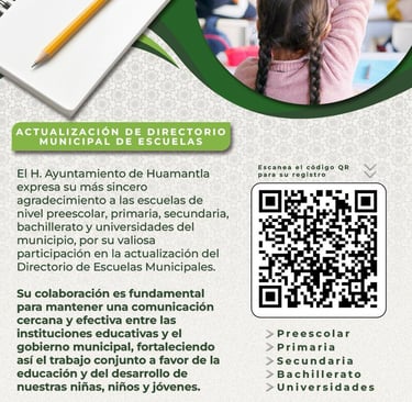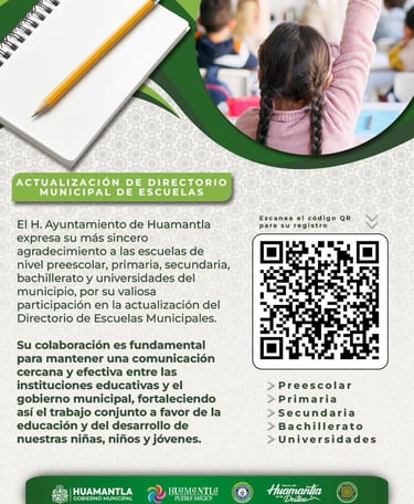 El H. Ayuntamiento de Huamantla invita a todas las instituciones educativas de nivel preescolar, primaria, secundaria, bachillerato y universidades a participar en la actualización del Directorio Municipal de Escuelas, con el objetivo de mantener una comunicación más directa y efectiva con cada plantel.