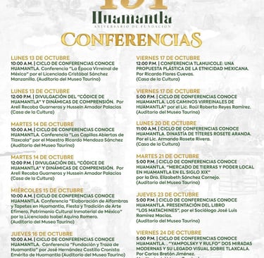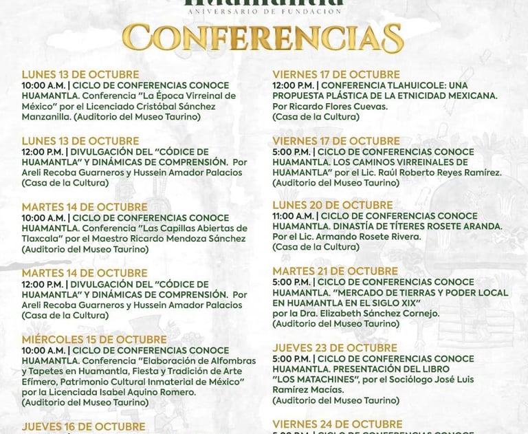 Durante estas jornadas, se presentarán diversas ponencias a cargo de historiadores, investigadores y personalidades locales y estatales, quienes compartirán temas que resaltan el legado, las tradiciones y los retos actuales de Huamantla.