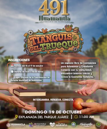 El H. Ayuntamiento de Huamantla, que encabeza el presidente municipal Salvador Santos Cedillo, invita a la ciudadanía a participar en el Tianguis del Trueque, que se llevará a cabo este domingo 19 de octubre a las 11:00 de la mañana en la Explanada del Parque Juárez.