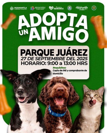Con el propósito de brindar una segunda oportunidad a perros y gatos que buscan un hogar, este sábado 27 de septiembre se llevará a cabo una jornada de adopción en el Parque Juárez de Huamantla, en un horario de 9:00 a 13:00 horas.