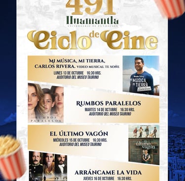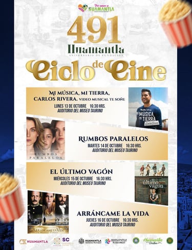 Huamantla, Tlax.- Sábado 11 Octubre 2025.- El H. Ayuntamiento de Huamantla, a través de la Dirección de Turismo, Cultura y Desarrollo Taurino, invita a la ciudadanía a disfrutar del Ciclo de Cine que se llevará a cabo del 13 al 16 de octubre en el Auditorio del Museo Taurino, a partir de las 4:30 de la tarde, como parte de las actividades conmemorativas por el 491 aniversario de la fundación de Huamantla.