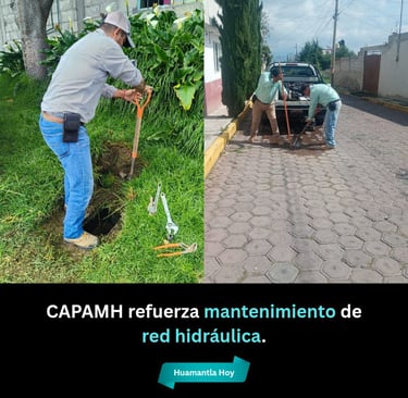 Huamantla, Tlax. lunes 20 de Octubre 2025. - La Comisión de Agua Potable y Alcantarillado del Municipio de Huamantla (CAPAMH), continúa realizando acciones de mantenimiento y reparación en distintos puntos de la ciudad, con el propósito de garantizar un servicio eficiente y cuidar uno de los recursos más valiosos: el agua.