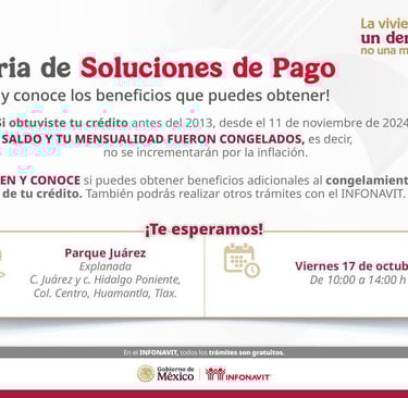 El Infonavit Tlaxcala, llevará a cabo la Feria de Soluciones de Pago este viernes 17 de octubre, en beneficio de las y los derechohabientes de la zona oriente de la entidad.