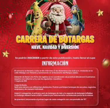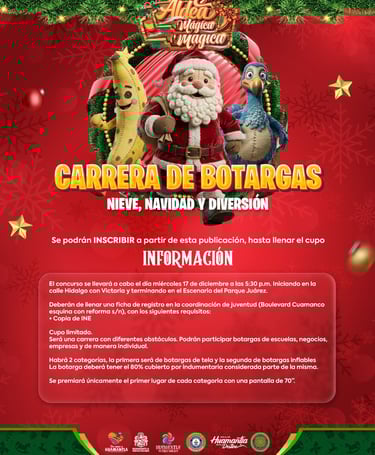 Huamantla, Tlax., 8 Diciembre 2025. -El Gobierno Municipal de Huamantla, que encabeza Salvador Santos Cedillo, a través de la Coordinación de Juventud, invita a escuelas, negocios, empresas y ciudadanía en general a participar en la tradicional Carrera de Botargas “Nieve, Navidad y Diversión”, que se realizará el miércoles 17 de diciembre a las 5:30 p.m.