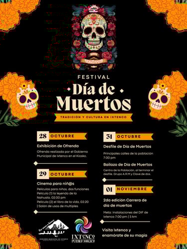 El festival dará inicio el 28 de octubre con la Exhibición de Ofrenda organizada por el Gobierno Municipal de Ixtenco en el kiosko del centro, donde habitantes y visitantes podrán apreciar los altares tradicionales que representan la conexión entre la vida y la muerte.