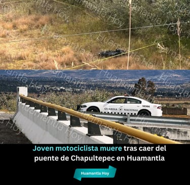 Huamantla, Tlax. - Lunes 15 Diciembre 2025.- Un joven motociclista perdió la vida la mañana de este lunes 15 de diciembre tras caer desde el puente elevado que comunica a la comunidad de Chapultepec con la carretera federal México–Veracruz, en el municipio de Huamantla.