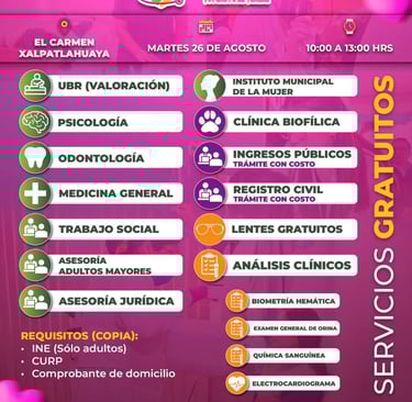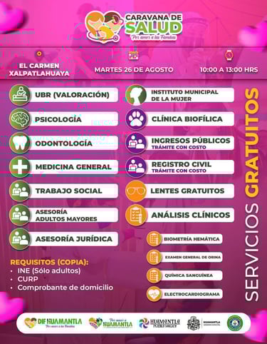 Huamantla, Tlax.- Martes 26 Agosto 2025.- Con el objetivo de acercar servicios esenciales y mejorar la calidad de vida de las familias huamantlecas, el Gobierno Municipal de Huamantla, que encabeza Salvador Santos Cedillo, a través del Sistema DIF Municipal, llevará a cabo este martes 26 de agosto una jornada más de la Caravana de Salud y Servicios en la comunidad de El Carmen Xalpatlahuaya.