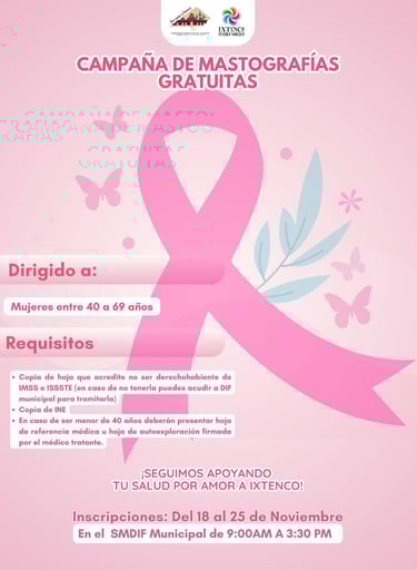 Ixtenco, Tlax., Martes 18 de Noviembre 2025. - El Gobierno Municipal de Ixtenco, encabezado por la Presidenta Municipal Aline Lazo Caballero, en coordinación con el Sistema Municipal DIF que preside Alicia Caballero Yonca, anunció el inicio de la Campaña de Mastografías Gratuitas, dirigida a mujeres de 40 a 69 años, con el objetivo de fortalecer la detección oportuna del cáncer de mama y promover el cuidado integral de la salud femenina.