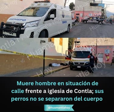 Contla de Juan Cuamatzi, Tlax.,– Martes 6 Enero 2026.- Un hombre en situación de calle perdió la vida este día en las inmediaciones de la Parroquia de San Bernardino, en la Séptima Sección del municipio de Contla de Juan Cuamatzi, en un hecho que llamó la atención de vecinos y feligreses debido a que tres perros permanecieron custodiando el cuerpo hasta la llegada de las autoridades.