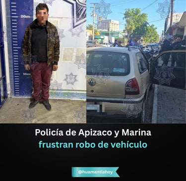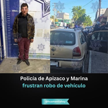 Apizaco,Tlax. Martes 13 de Enero 2026. - La Dirección de Seguridad Pública de Apizaco informó que elementos de la Policía Municipal, en coordinación con personal de la Secretaría de Marina, frustraron el robo de un vehículo y detuvieron al presunto responsable durante un recorrido de vigilancia en el bulevar 16 de Septiembre, a la altura de la avenida Lardizábal.