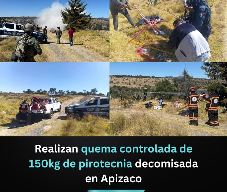 Apizaco, Tlax. Jueves 8 Enero 2026. La Dirección de Seguridad Pública, Vialidad y Transporte de Apizaco informó que, como resultado del operativo decembrino contra la venta irregular de pirotecnia, se realizó la quema controlada de 150 kilogramos de material pirotécnico decomisado.