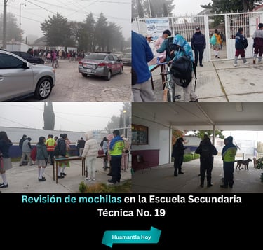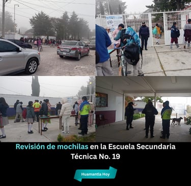 El Gobierno Municipal de El Carmen Tequexquitla informa que este día se llevó a cabo la revisión de mochilas en la Escuela Secundaria Técnica No. 19, con la participación de Seguridad Pública Municipal, Protección Civil y autoridades educativas.