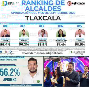 Huamantla, Tlax.- Viernes 3 Octubre 2025.- En el más reciente estudio de opinión correspondiente al mes de septiembre, la casa encuestadora Demoscopia Digital reveló que el Presidente Municipal de Huamantla, Salvador Santos Cedillo, alcanzó un 56.2 % de aceptación ciudadana, ubicándose en el segundo lugar dentro del ranking de alcaldes del estado de Tlaxcala.