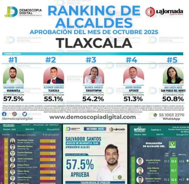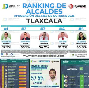 Este resultado coincide con la medición de Demoscopia Digital, que en su ranking estatal lo ubica en el primer lugar entre los alcaldes de Tlaxcala, obteniendo una aprobación del 57.5%, consolidándose como el mejor evaluado en la entidad.