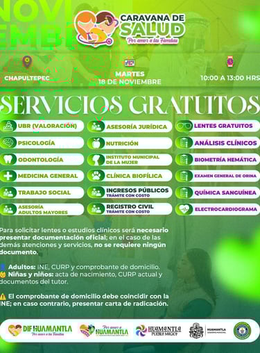 Huamantla, Tlax., 17 Noviembre 2025. El Sistema Municipal para el Desarrollo Integral de la Familia (SMDIF) Huamantla continúa reforzando sus acciones de atención directa a las familias huamantlecas, y este martes 18 de noviembre llegará a la comunidad de Chapultepec con una nueva jornada de salud y servicios gratuitos.