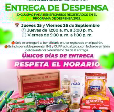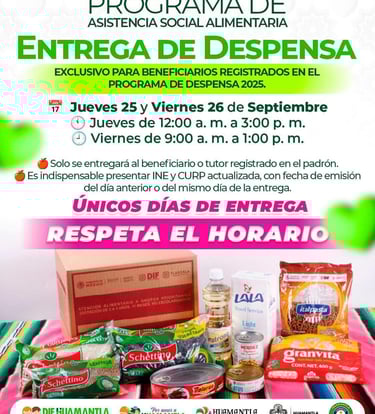 Huamantla, Tlax.- Martes 23 Septiembre 2025.- El Sistema Municipal para el Desarrollo Integral de la Familia (SMDIF) Huamantla informa a las y los beneficiarios del Programa de Asistencia Social Alimentaria que la entrega de despensas correspondientes al mes de septiembre se realizará los días jueves 25 y viernes 26 de septiembre, únicamente para las personas registradas en el padrón 2025.