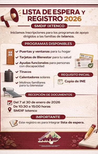 SMDIF #Ixtenco abre inscripciones para la Lista de Espera de Programas de Apoyo 2026