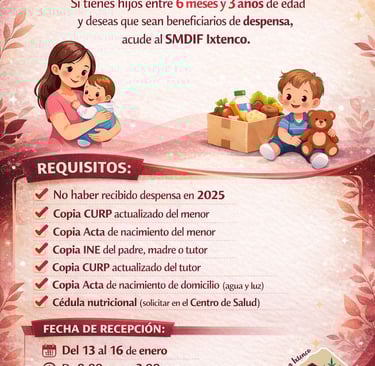 Ixtenco, Tlax. Martes 13 Enero 2026. -El Sistema Municipal para el Desarrollo Integral de la Familia (SMDIF) Ixtenco anunció el inicio del periodo de recepción de documentos para que niñas y niños de 6 meses a 3 años de edad puedan ser beneficiarios del programa de apoyo de despensa, dirigido a fortalecer la nutrición y bienestar de la primera infancia en el municipio.