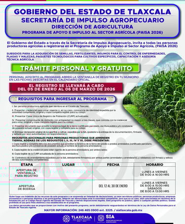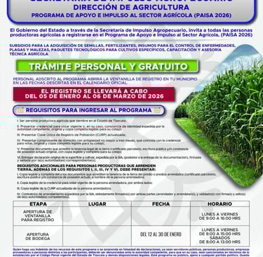 #Tequexquitla | El Gobierno Municipal de El Carmen Tequexquitla anuncia: del 12 al 30 de enero de 2026 se realizará el registro al Programa PAISA 2026 , el cual ofrece subsidios para insumos agrícolas, paquetes tecnológicos, capacitación y asesoría técnica. El trámite es personal y gratuito. Para más información, llamar al 246 465 0900 ext. 2225 o consultar siatlaxcala.gob.mx.