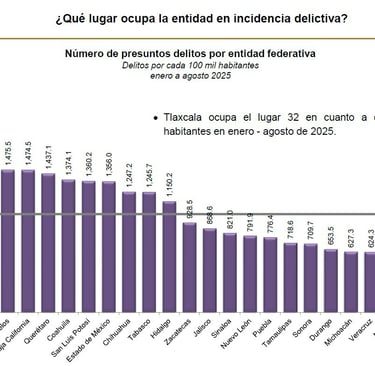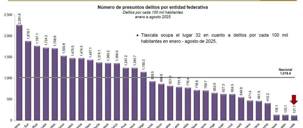Martes 23 de septiembre 2025.- De enero a agosto de este año, Tlaxcala fue el estado con menor incidencia delictiva en México, con una tasa de 121.1 delitos por cada 100 mil habitantes, de acuerdo con el más reciente informe del Secretariado Ejecutivo del Sistema Nacional de Seguridad Pública (SESNSP).